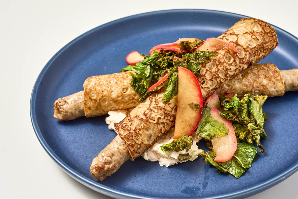 Crepe Wrapped Breakfast Sausage with Whipped Sharp Cheddar Spread, Wilted Kale and Apples