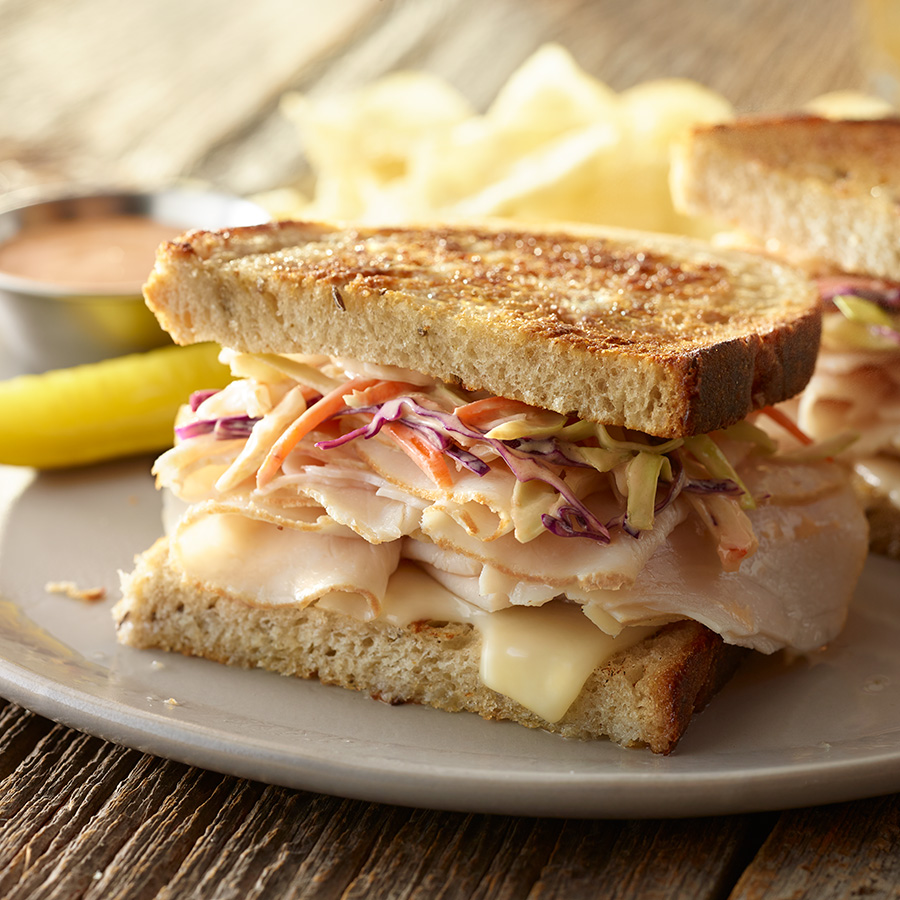 2. The Rachel: A popular alternative to the classic Reuben with ingredients you might already have on hand featuring smoked turkey, swiss, thousand island dressing and slaw.