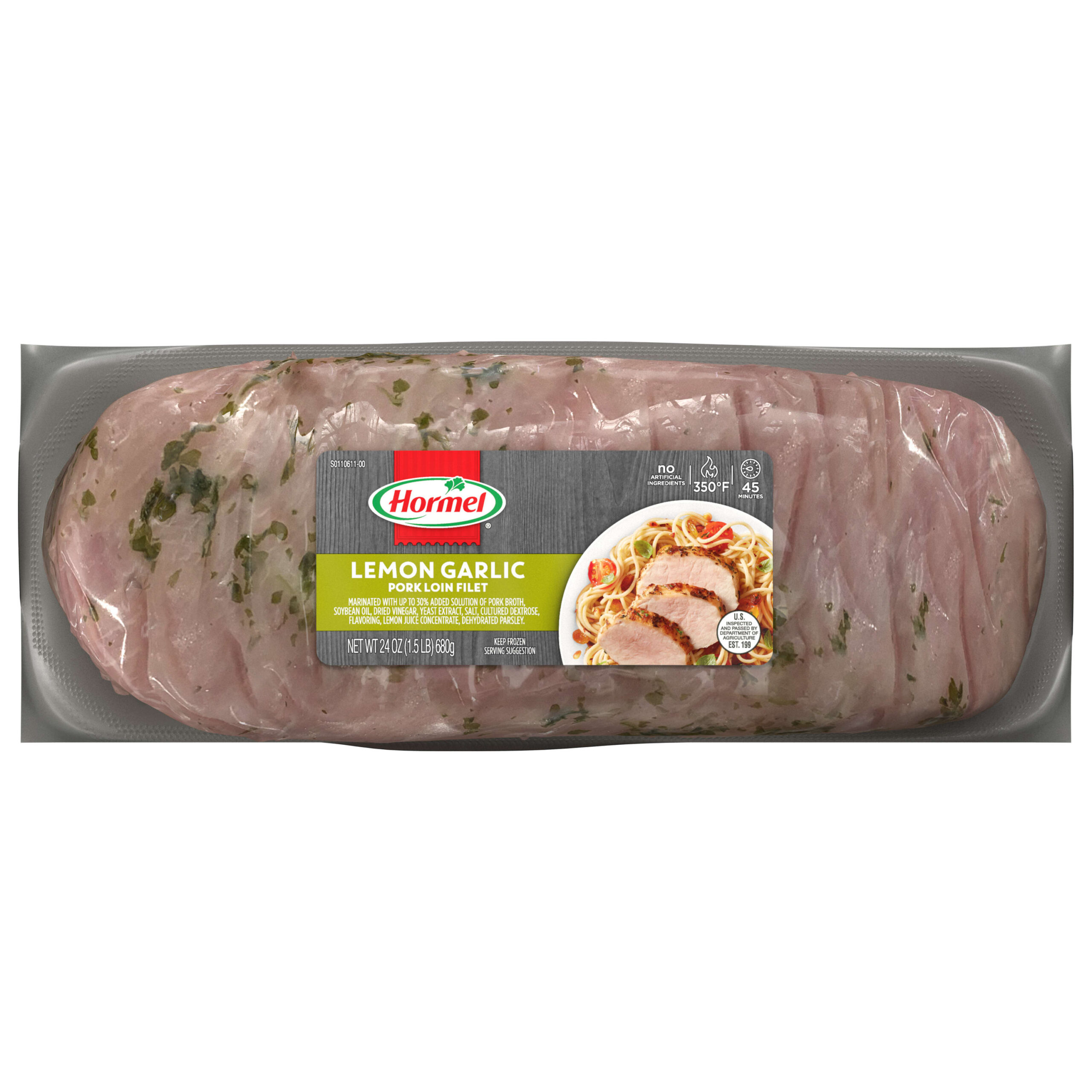 Frozen, boneless, pork loin filets marinated with lemon garlic marinade and trimmed of excess fat. Marinated to hold a robust lemon-garlic seasoning & preserve tenderness.
