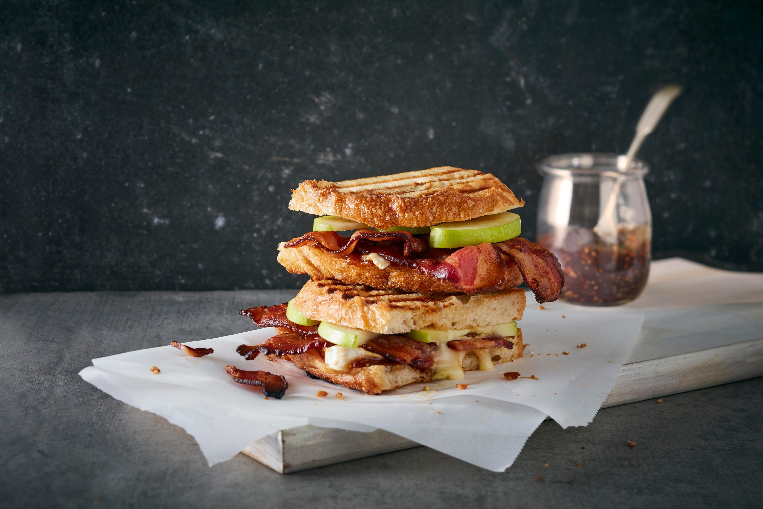 HORMEL® Turkey Breast sliced, OLD SMOKEHOUSE® Applewood Bacon, sliced Gouda (or Cheddar), tomato and leaf lettuce served on sliced multigrain bread.