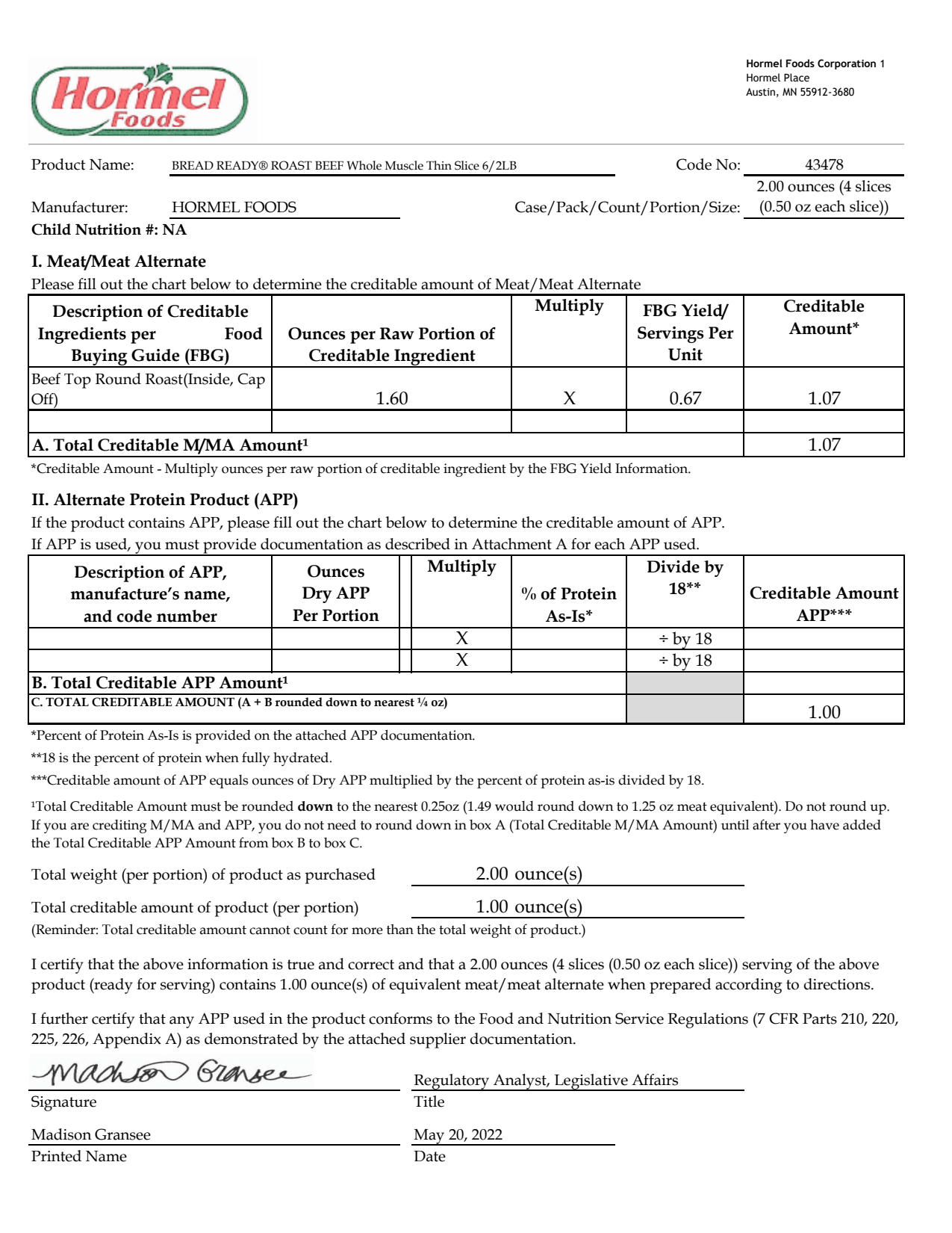 - Sliced for ease of portioning, exact portion control, convenience, and reduced labor costs.