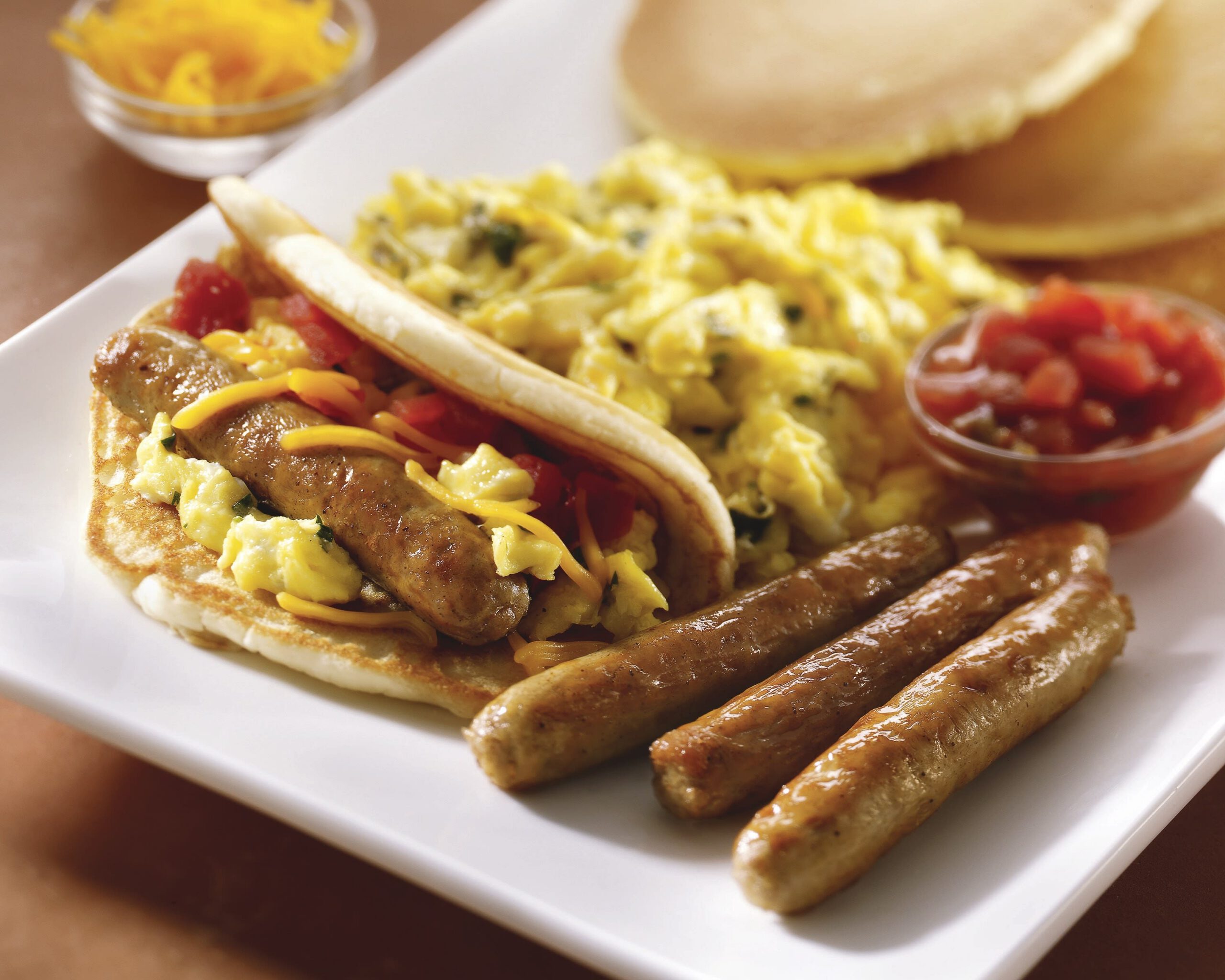 OBRAS MAESTRAS® Pork Breakfast Sausage Fine Crumble, scrambled eggs and shredded cheddar cheese rolled in a flour tortilla.