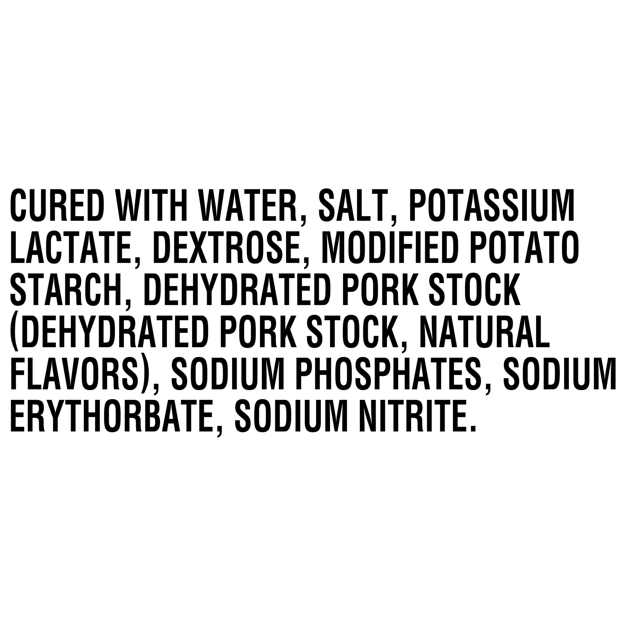 WITH NATURAL JUICES Cured With Water, Salt, Potassium Lactate, Dextrose, Modified Potato Starch, Dehydrated Pork Stock (Dehydrated Pork Stock, Natural Flavors), Sodium Phosphates, Sodium Erythorbate, Sodium Nitrite.