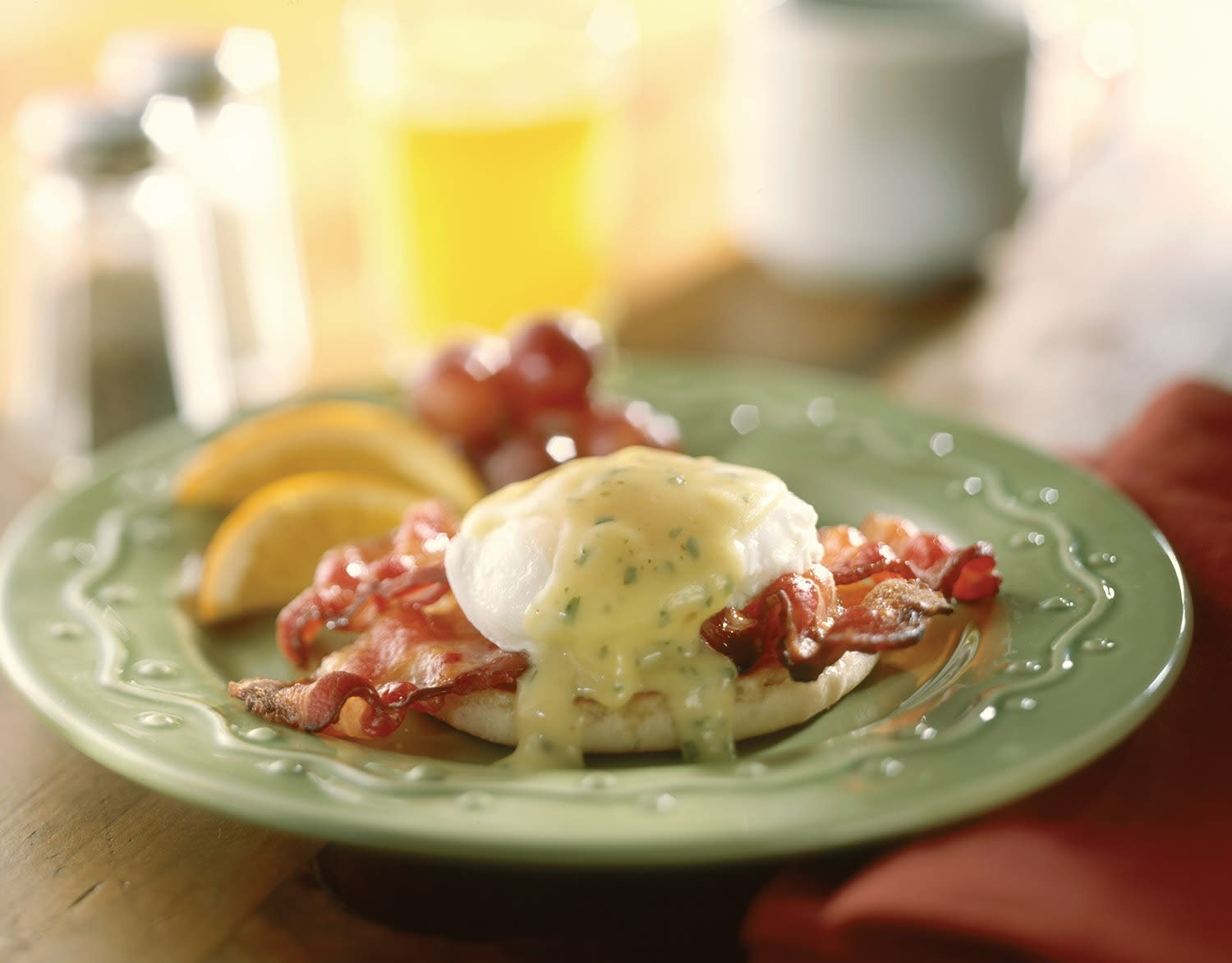 OLD SMOKEHOUSE® Pecanwood Bacon, poached eggs, and greens on a toasted English muffin topped with hollandaise sauce & fresh herbs.