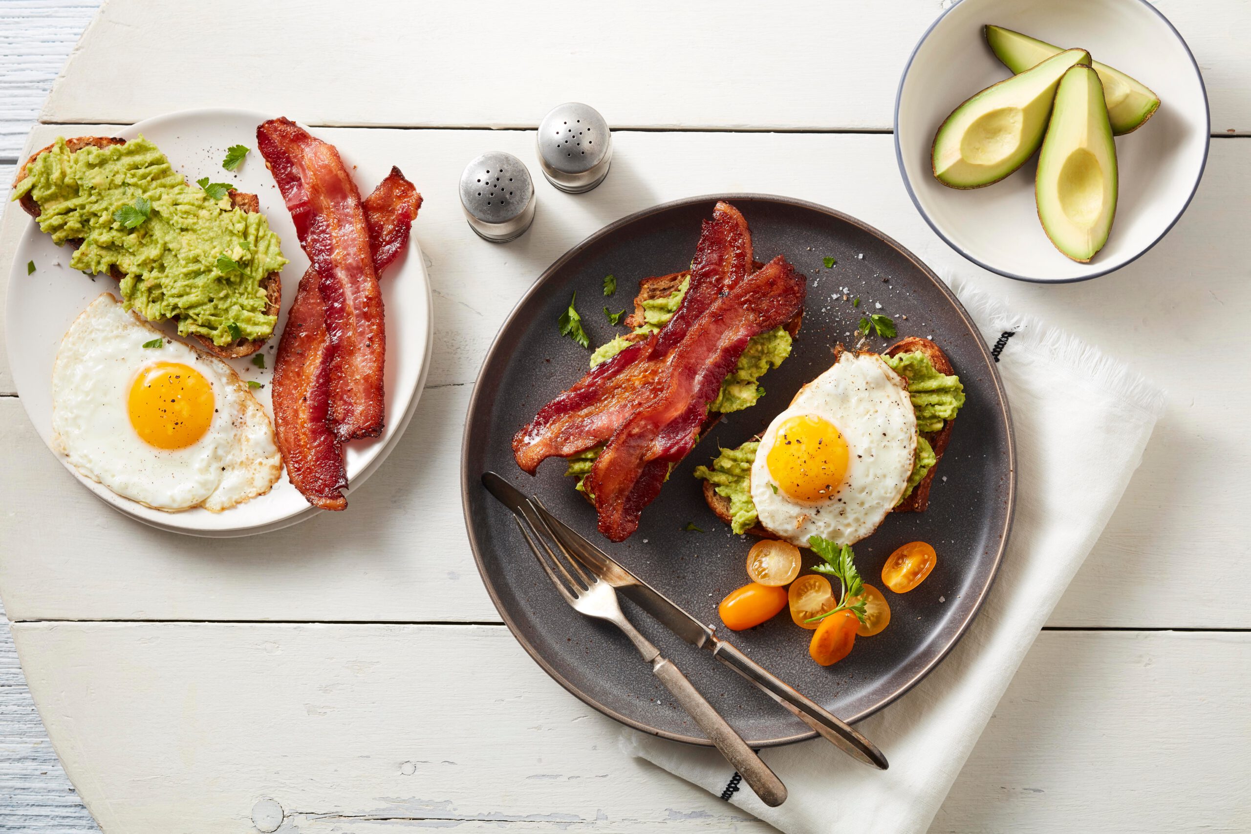 Toast with mashed avocado, over easy eggs, greens & OLD SMOKEHOUSE® Applewood Bacon.