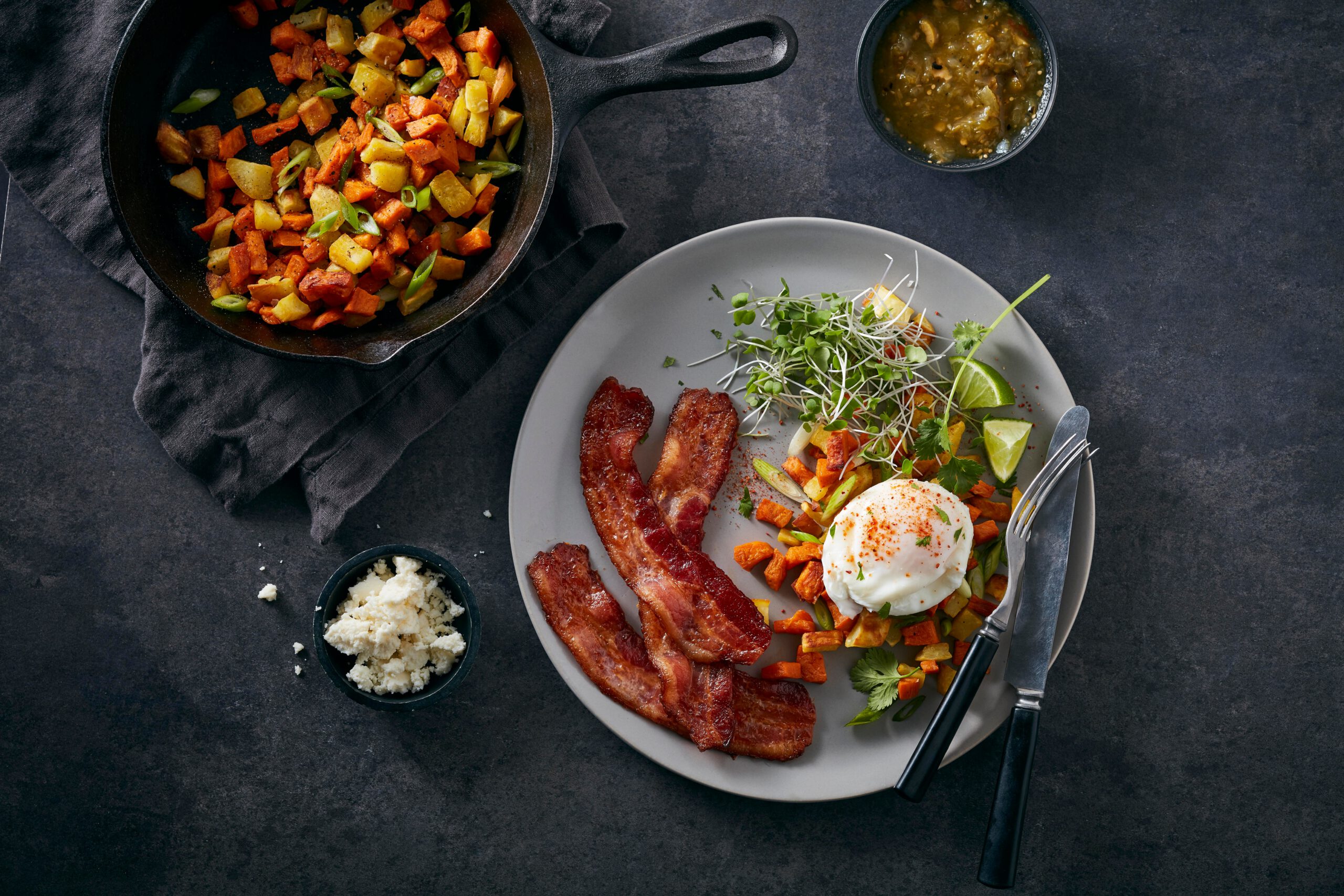 Roasted sweet potato, onion, garlic, greens, peppers, cilantro and lime, topped with a poached egg served along side OLD SMOKEHOUSE® Applewood Bacon.