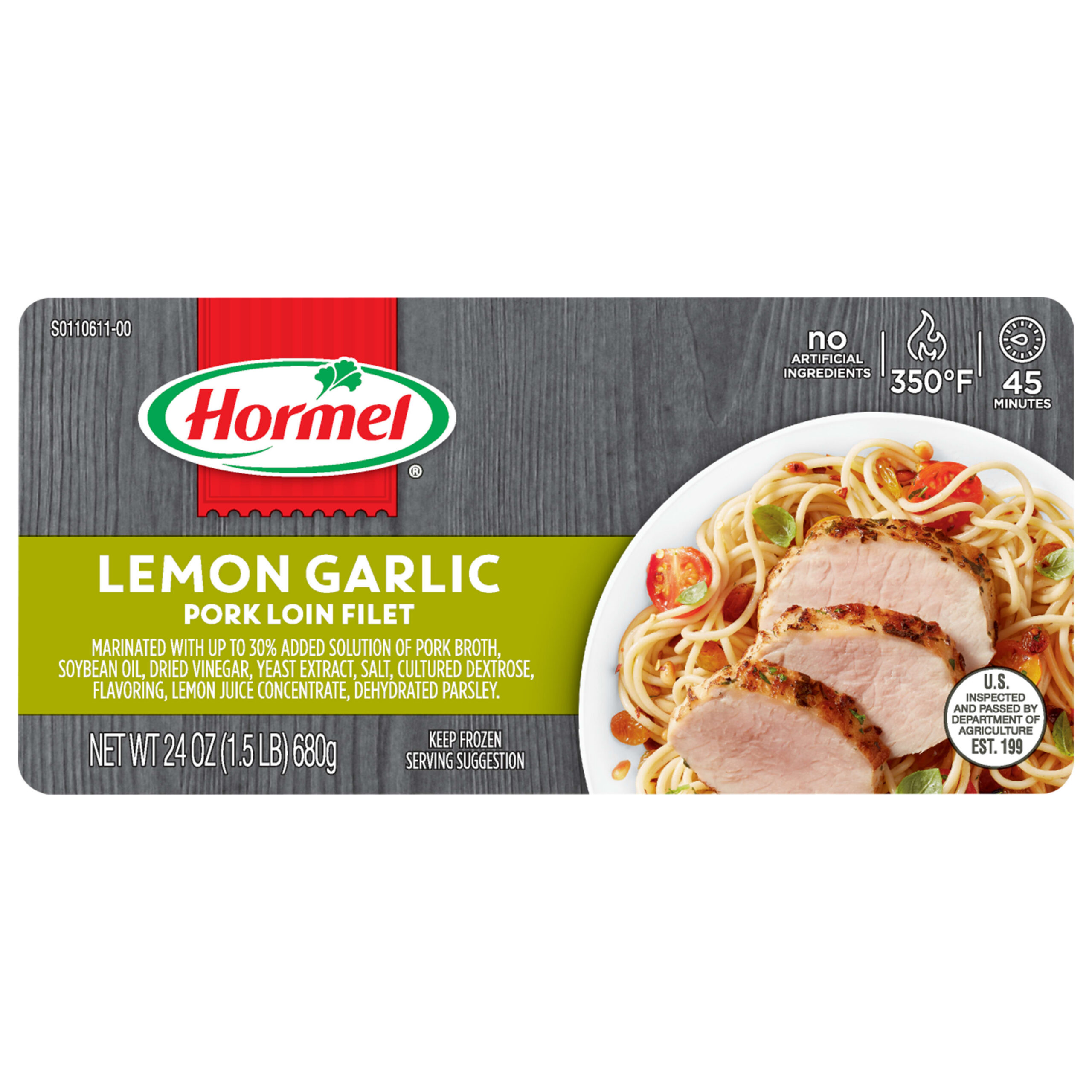 Frozen, boneless, pork loin filets marinated with lemon garlic marinade and trimmed of excess fat. Marinated to hold a robust lemon-garlic seasoning & preserve tenderness.