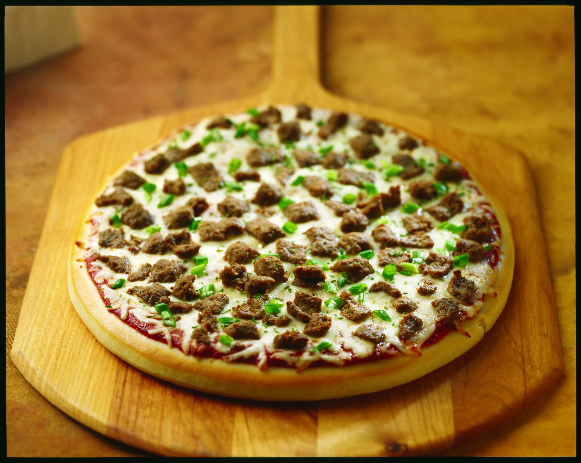 Bacon Cheeseburger Pizza topped with MASTERPIECES® Beef Topping, bacon topping, cheddar cheese and mozzarella.