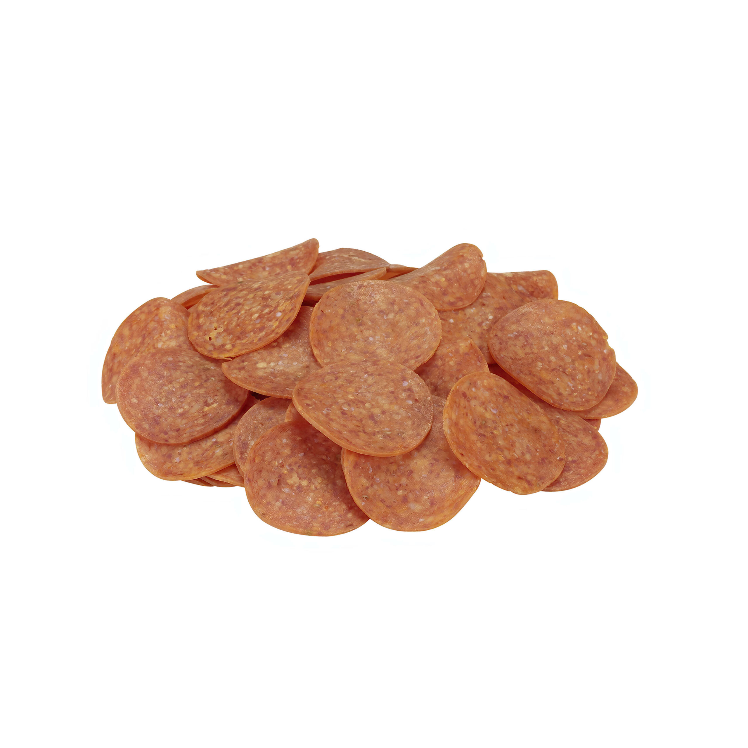 This sliced pepperoni is made from pork and beef cuts. It has a classic flavor with a balance of sweet, savory, and spice. This pepperoni resists cupping, charring, and grease-out. This product has a diameter of 1.75 inches (4.5cm).