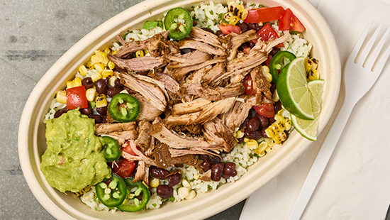 Savor a flavorful bowl featuring tender Barbacoa, paired with zesty cilantro rice and black beans. Enjoy a vibrant mix of fresh corn, ripe tomatoes and jalapeño peppers, topped with cheese and guacamole. Finish with Cilantro and a squeeze of Lime.